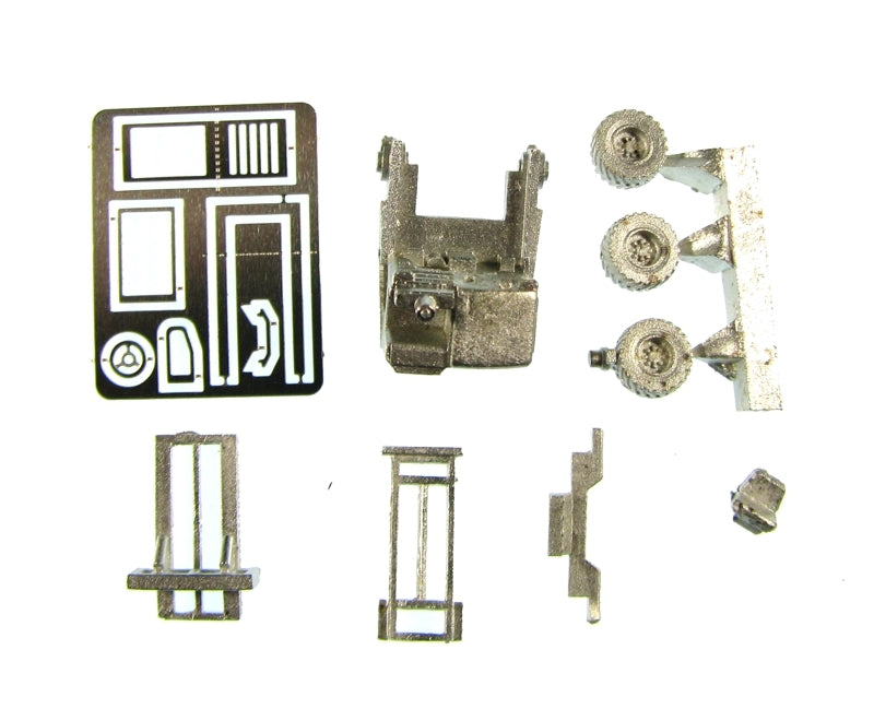This is a truck mounted donkey forklift for local or OTR freight delivery. The kit can be assembled in different configurations for operation or transport. Super detailed stainless steel photo etch parts are included.